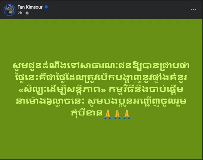 យោង​តាម​សំណេរ​ដែល​បង្ហោះ​ដោយ​លោក តាន់ គីមសួរ បាន​ឱ្យ​ដឹង​ថា ថ្ងៃ​នេះ​ជា​ថ្ងៃ​បើក​បង្ហាញ​ផ្ទាំង​គំនូរ​សិល្បៈ​ដើម្បី​សន្តិភាព ដោយ​កម្មវិធីចាប់ផ្ដើម​ពី​ម៉ោង ៦ ល្ងាច​ត​ទៅ នៅសួនច្បារវត្តមុទុមវត្តី។