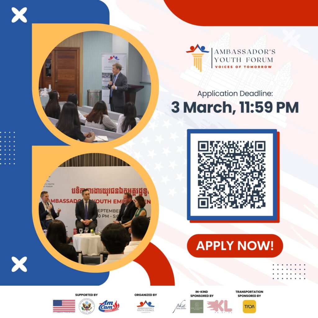 ភ្នំពេញ៖ នៅថ្ងៃទី២៨ ខែមីនា ឆ្នាំ២០២៦ ខាងមុខនេះ ស្ថានទូតសហរដ្ឋអាម៉េរិកប្រចាំកម្ពុជា ក្រុមប្រឹក្សាយុវជនអគ្គរដ្ឋ​ទូតសហរដ្ឋអាម៉េរិក នឹងបើកកិច្ចពិភាក្សាមួយក្នុងគោលបំណងពង្រឹងទំនាក់ទំនងសេដ្ឋកិច្ច ពាណិជ្ជកម្មរវាងកម្ពុជា និងសហរដ្ឋអាម៉េរិក។